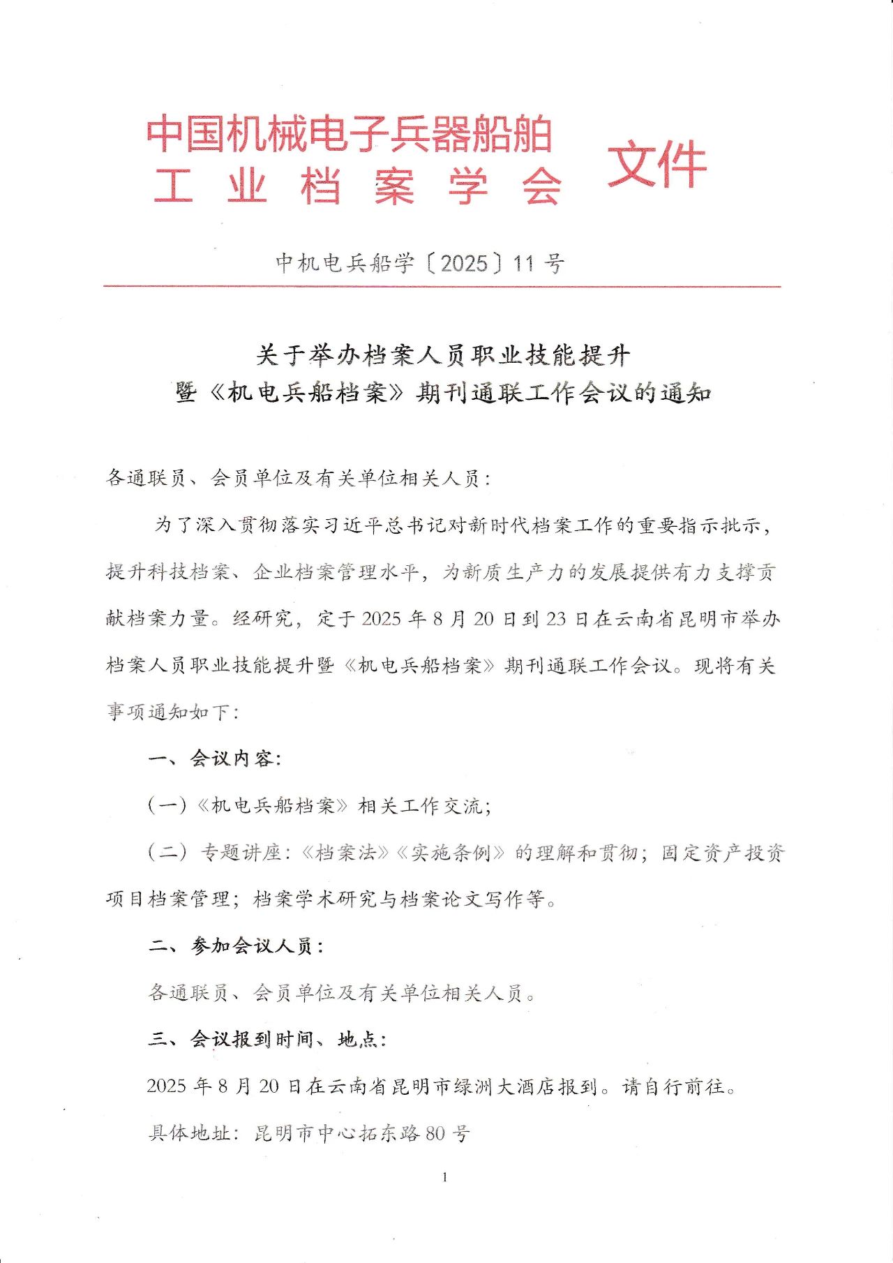 关于举办档案人员职业技能提升暨《机电兵船档案》期刊通联工作会议的通知